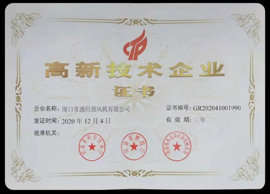 2020�12�4日,经国家税务总局河南省税务局、河南省财政厅、河南省科学技术厅认真评审,周口市通用鼓风机有限公司顺利荣�“高新技术企�”证书。这是政府及社会各界对公司的认可,我们将以此为动力,努力的打�"周口风机”品牌,生产出更好的产品来回馈客户�